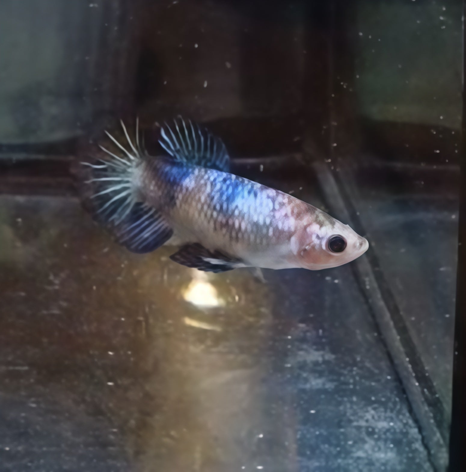 La Betta Hembra HalfMoon Plakat es un ejemplar lleno de elegancia y brillo. Su cuerpo compacto y sus aletas cortas tipo Plakat resaltan una tonalidad azul profunda con destellos iridiscentes, que cambian sutilmente según la luz, ofreciendo un efecto metálico cautivador.