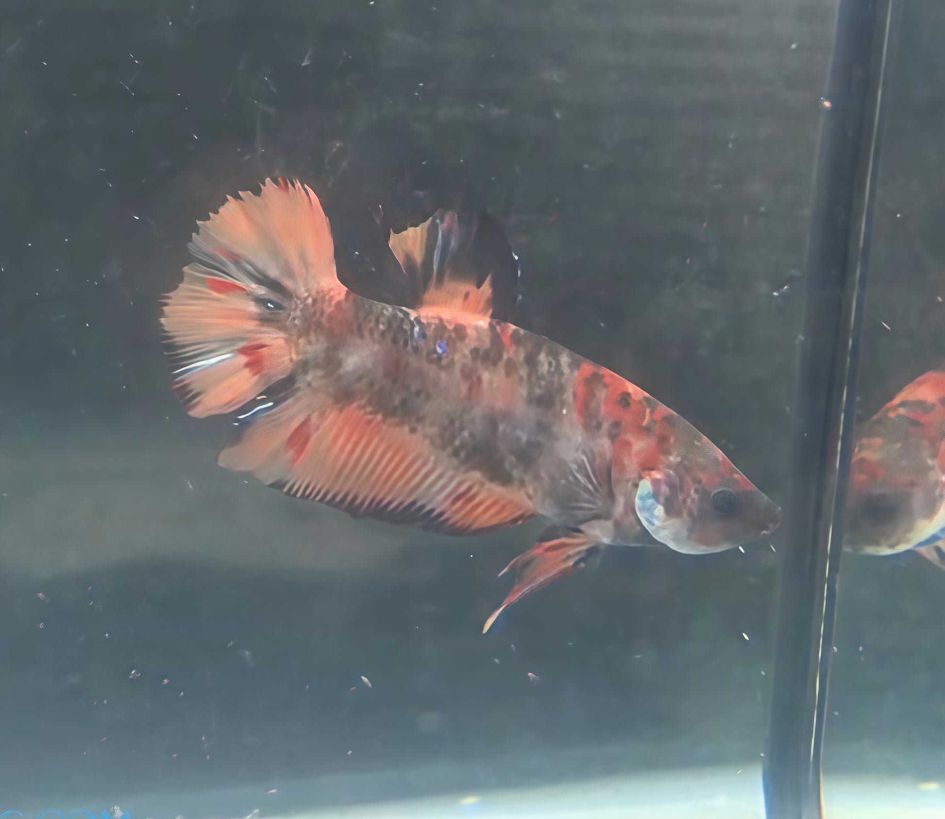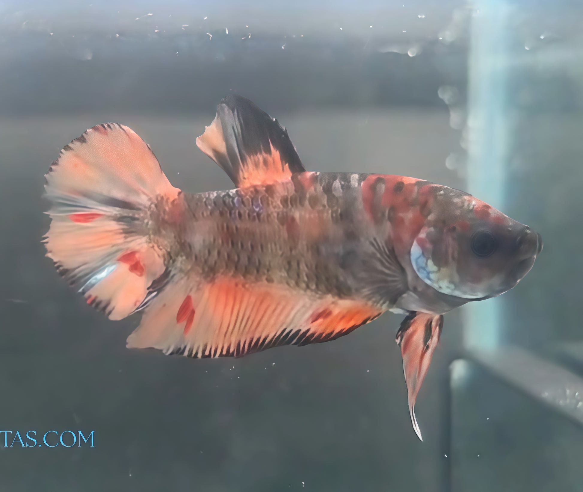 El Betta Macho HalfMoon Plakat Armagedon es un ejemplar exclusivo, famoso por su imponente combinación de tonos rojos, naranjas y negros, que evocan un efecto “llamas” único en sus escamas y aletas. Su espectacular cola en forma de media luna de 180° y su cuerpo compacto estilo Plakat lo convierten en un pez fuerte, ágil y lleno de personalidad.