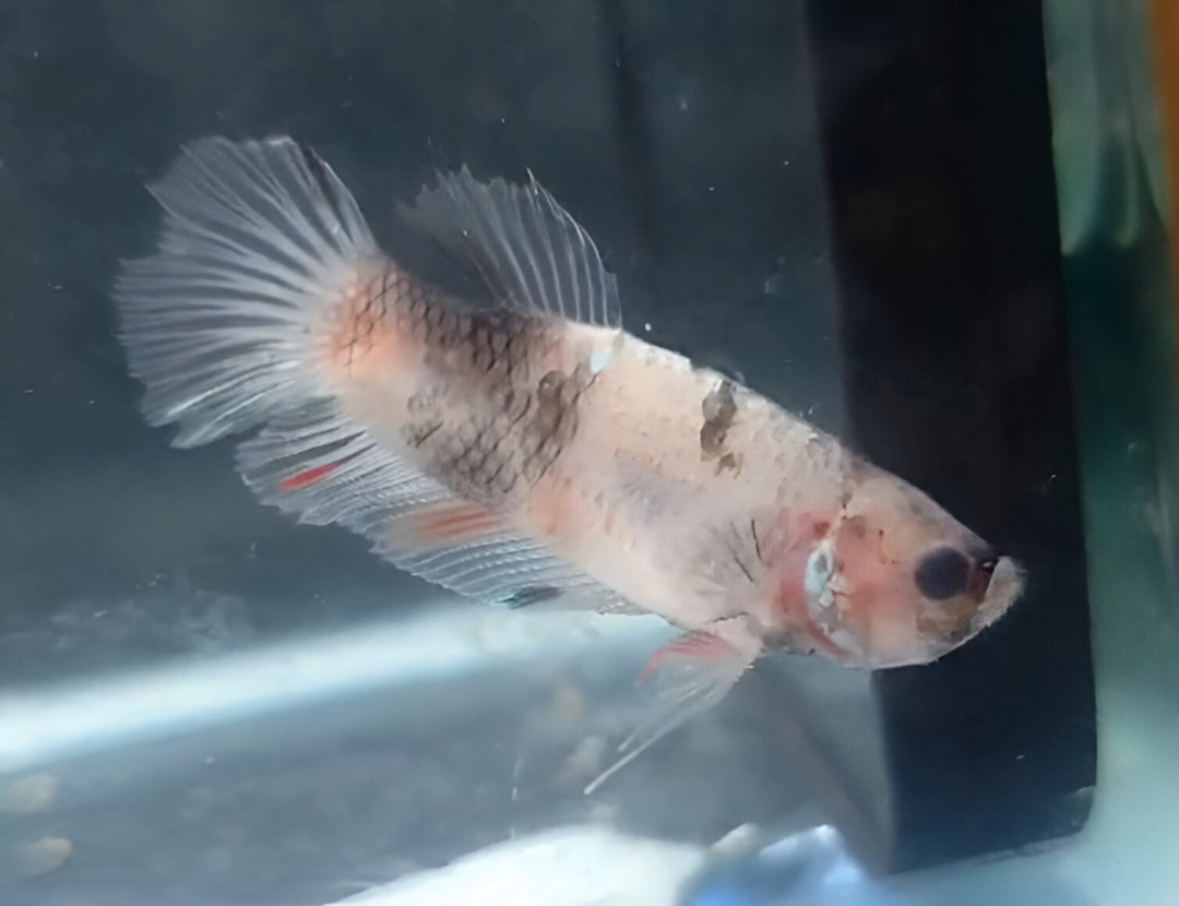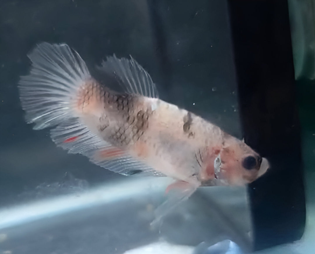 El Betta Macho HalfMoon Plakat Celofán es un ejemplar único y elegante, caracterizado por su coloración traslúcida y perlada, que deja entrever las escamas y aletas con un efecto delicado y brillante. Su cuerpo compacto y su cola HalfMoon de apertura de hasta 180° lo convierten en un pez equilibrado entre fuerza, resistencia y belleza sutil.