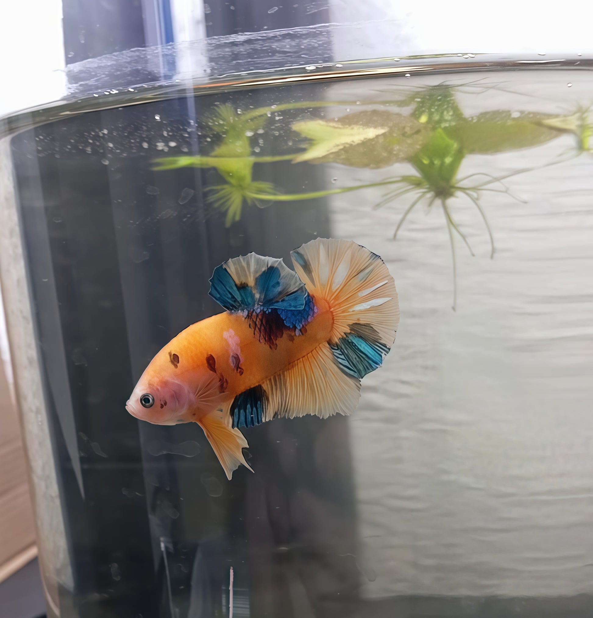 La genética HalfMoon Plakat le aporta aletas cortas y fuertes, resaltando aún más su cuerpo compacto y sus colores explosivos. Este ejemplar es perfecto para coleccionistas exigentes o criadores que buscan mejorar la calidad y diversidad de sus líneas.